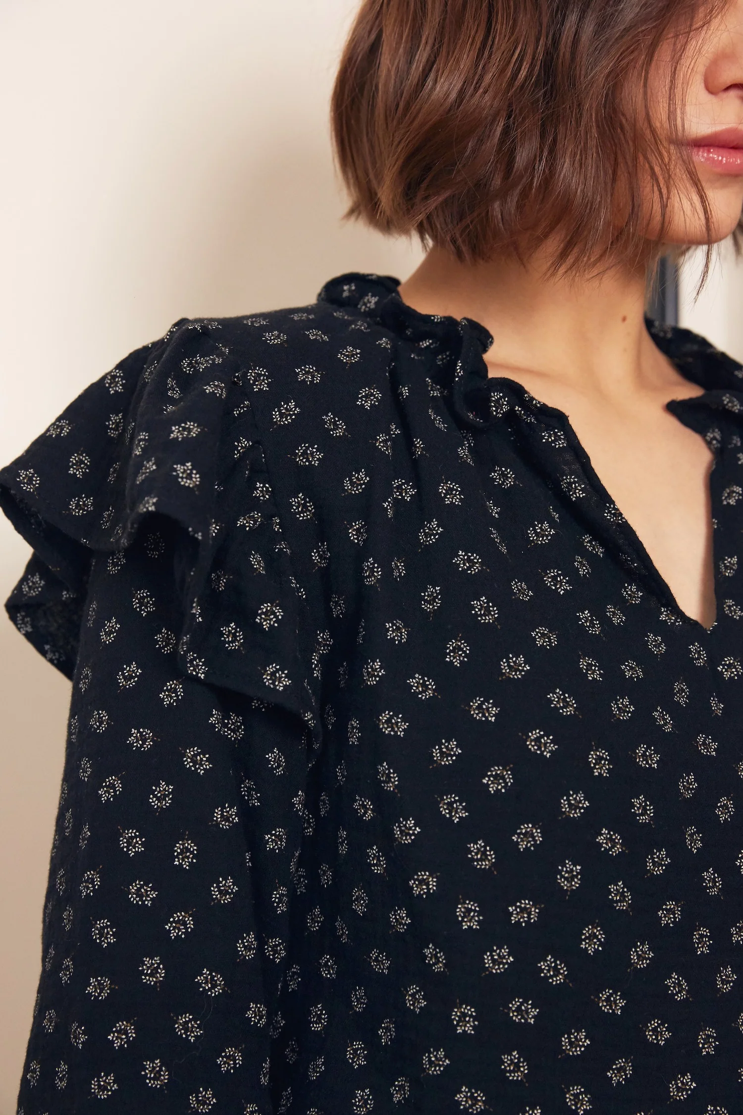 En double gaze de coton biologique et volantée à souhait, voici notre nouvelle blouse chouchou ! On adore son motif léger, son col et ses poignets froncés et son décolleté en V parfait. Une blouse originale avec un sublime volume, très agréable à porter.