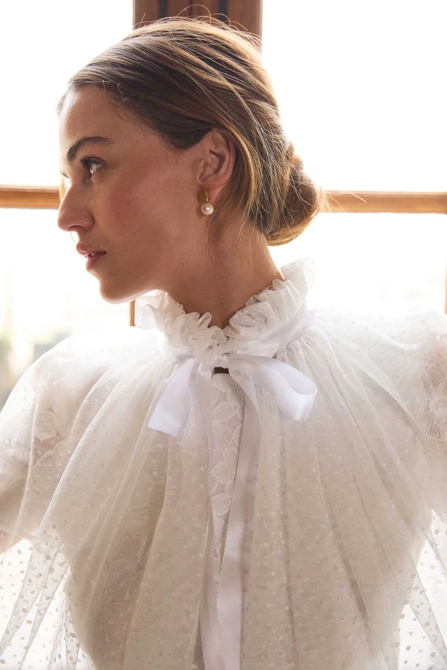 Charme et poésie pour cette capeline qui enveloppe la mariée dans un nuage de plumetis. Le col froncé encadre le visage et le jeu de transparence apporte beaucoup d'élégance à la silhouette. Idéale pour une cérémonie, elle pourra remplacer un voile ou réchauffer la mariée pendant un cocktail à l'extérieur.