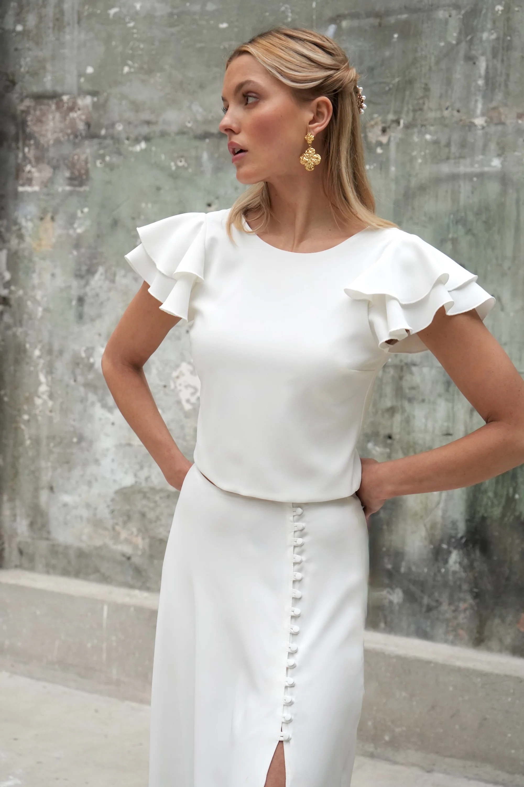 Une jupe longue exceptionnelle qui séduit par son volume, sa légèreté et son boutonnage ouvert devant. Coupée entièrement dans le biais, elle suit avec grâce les mouvements et dévoile joliment la jambe. Une traîne vient finir cette allure de rêve. Elle se marie parfaitement à nos hauts en dentelle ou à nos blouses dans un crêpe assorti.