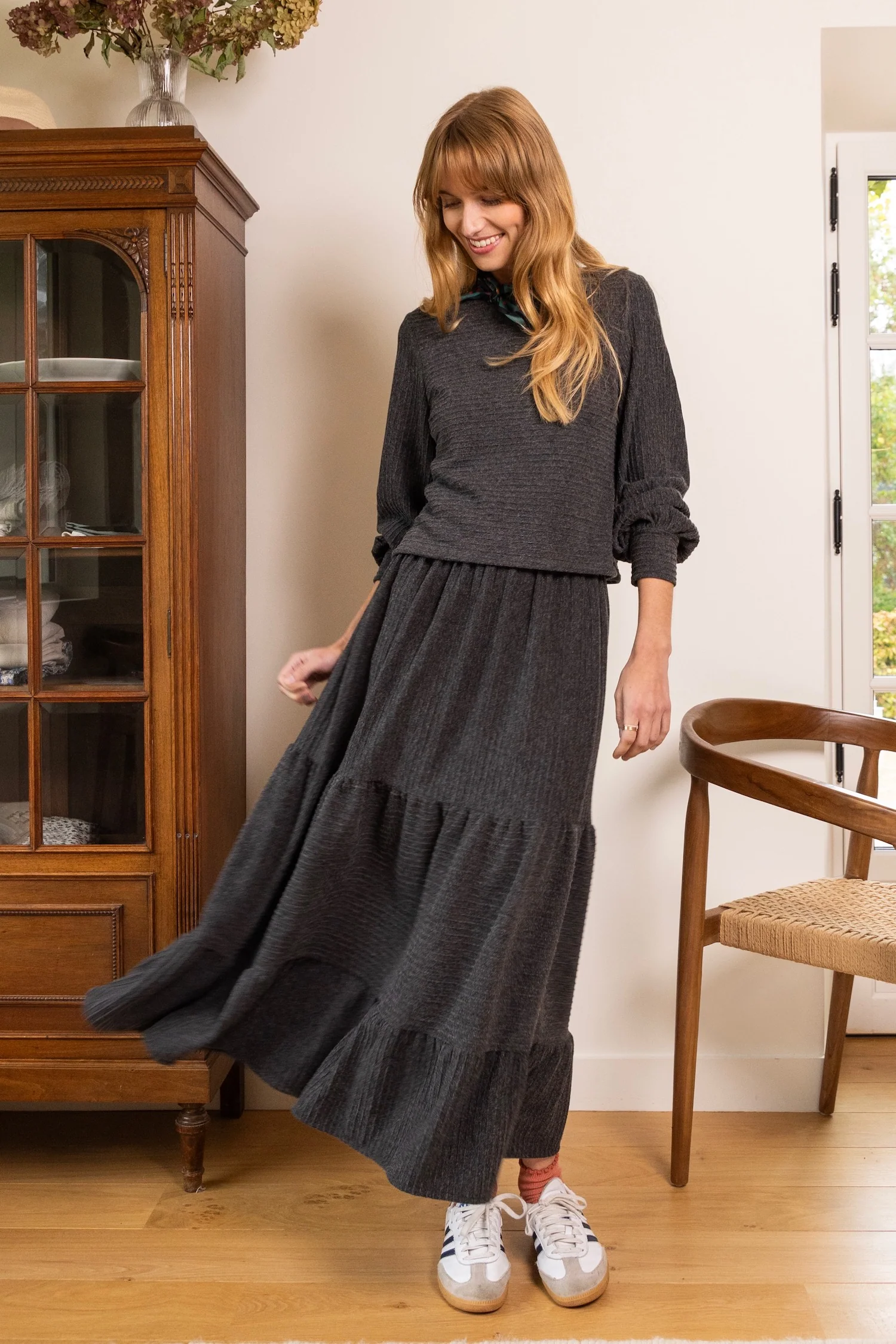 Confectionnée dans une maille grise toute douce, on adore sa longueur idéale, sa coupe volantée qui lui donne un mouvement parfait et sa taille élastiquée. Elle se porte facilement en toute saison, avec un pull et des bottes en hiver, ou un simple t-shirt au printemps. On l'associe à notre top Loulou dans la même maille pour un ensemble très stylé !