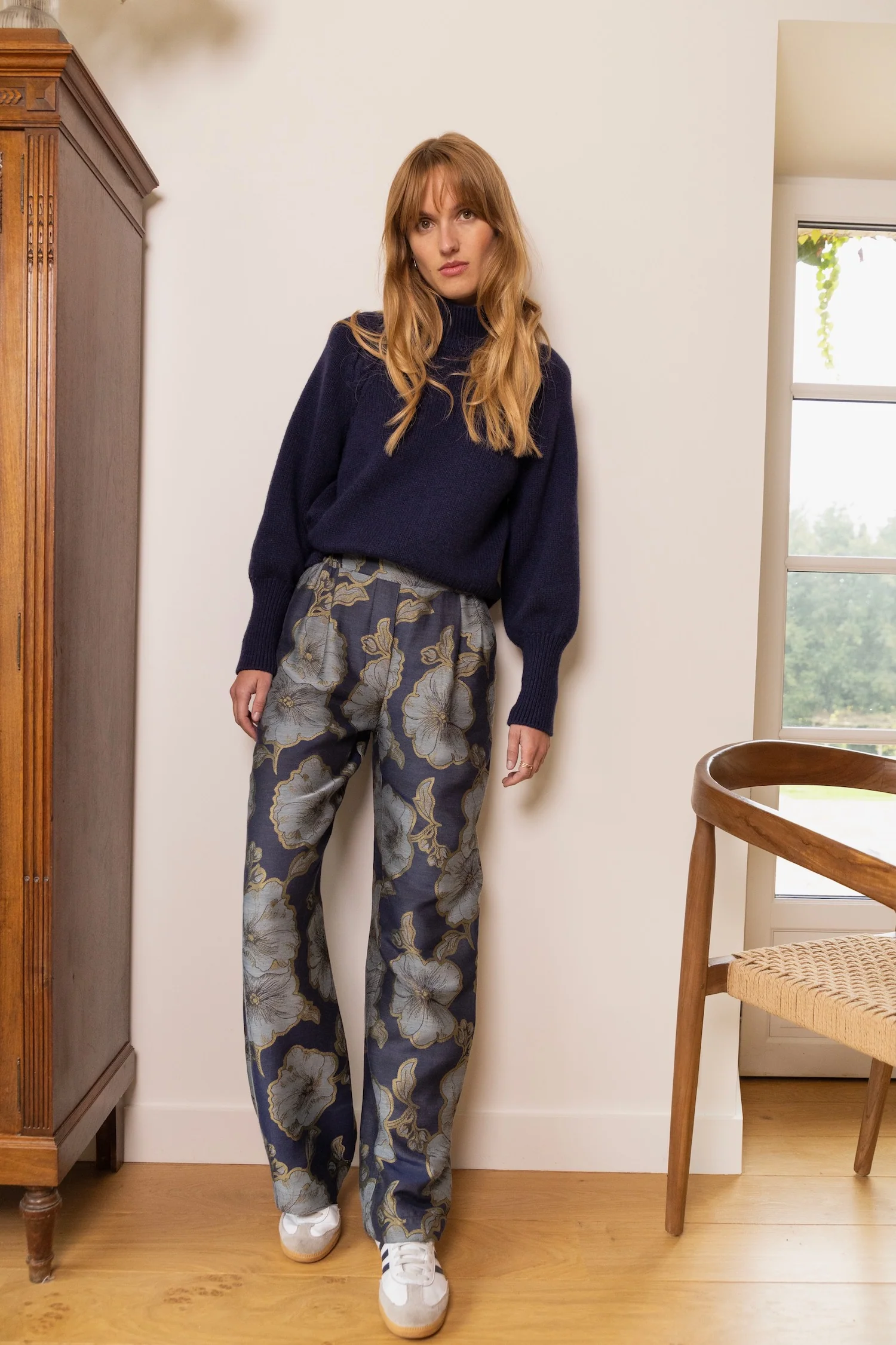 Avec son imprimé fleuri, il apporte une touche d’audace et de féminité qui s’accorde facilement à un petit pull tout simple. Ce sublime pantalon entièrement confectionné en France ne laissera pas indifférent ! Son luxueux jacquard a été tissu en région lyonnaise par une Entreprise du Patrimoine Vivant.