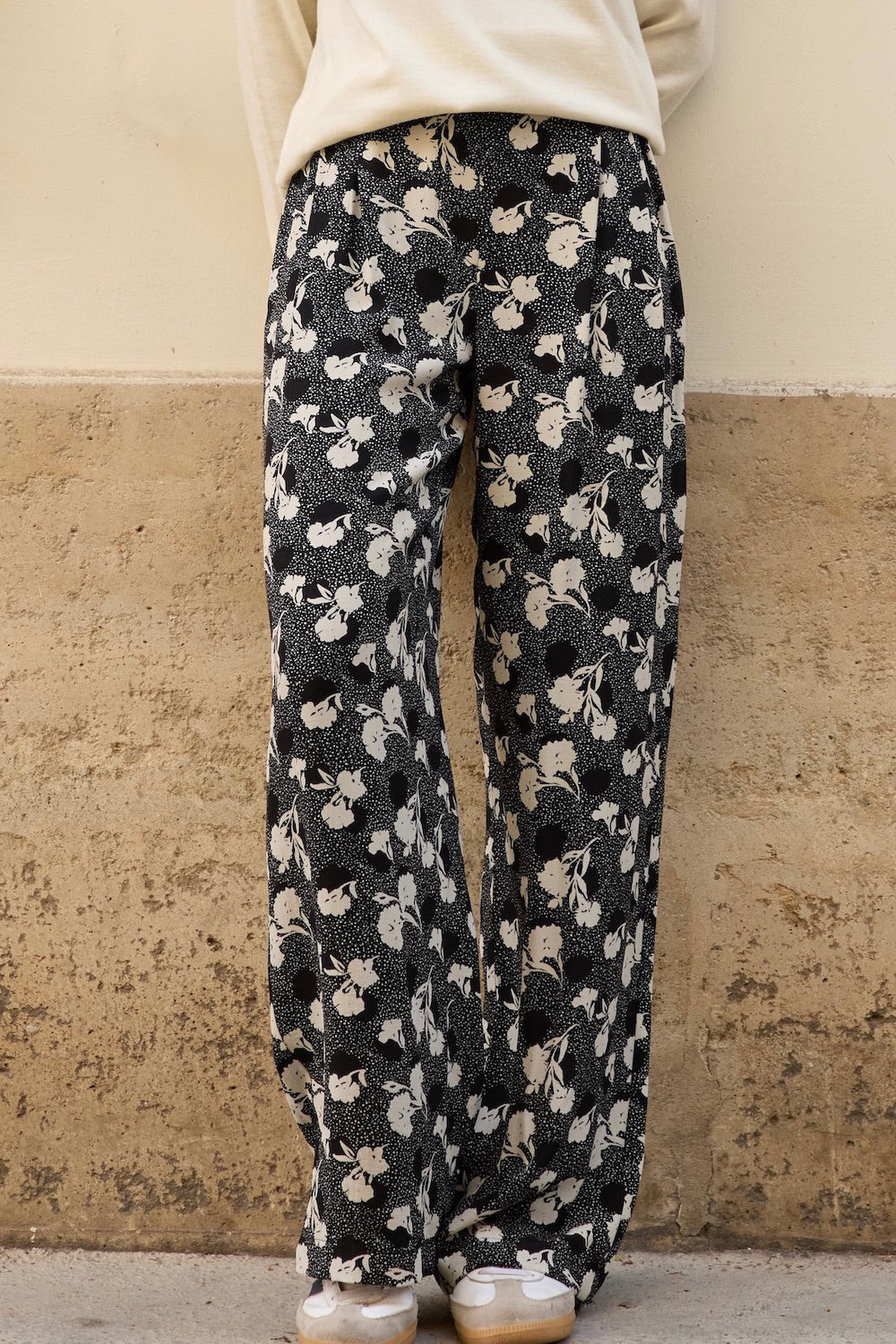 Notre pantalon iconique revient dans un tissu fluide noir et blanc à l'imprimé fleuri. On adore sa coupe taille haute qui allonge la jambe, ses pinces qui lui donne son élégance décontractée et son élastique dans le dos qui lui confère un véritable confort. Son succès depuis plusieurs saisons parle pour lui !