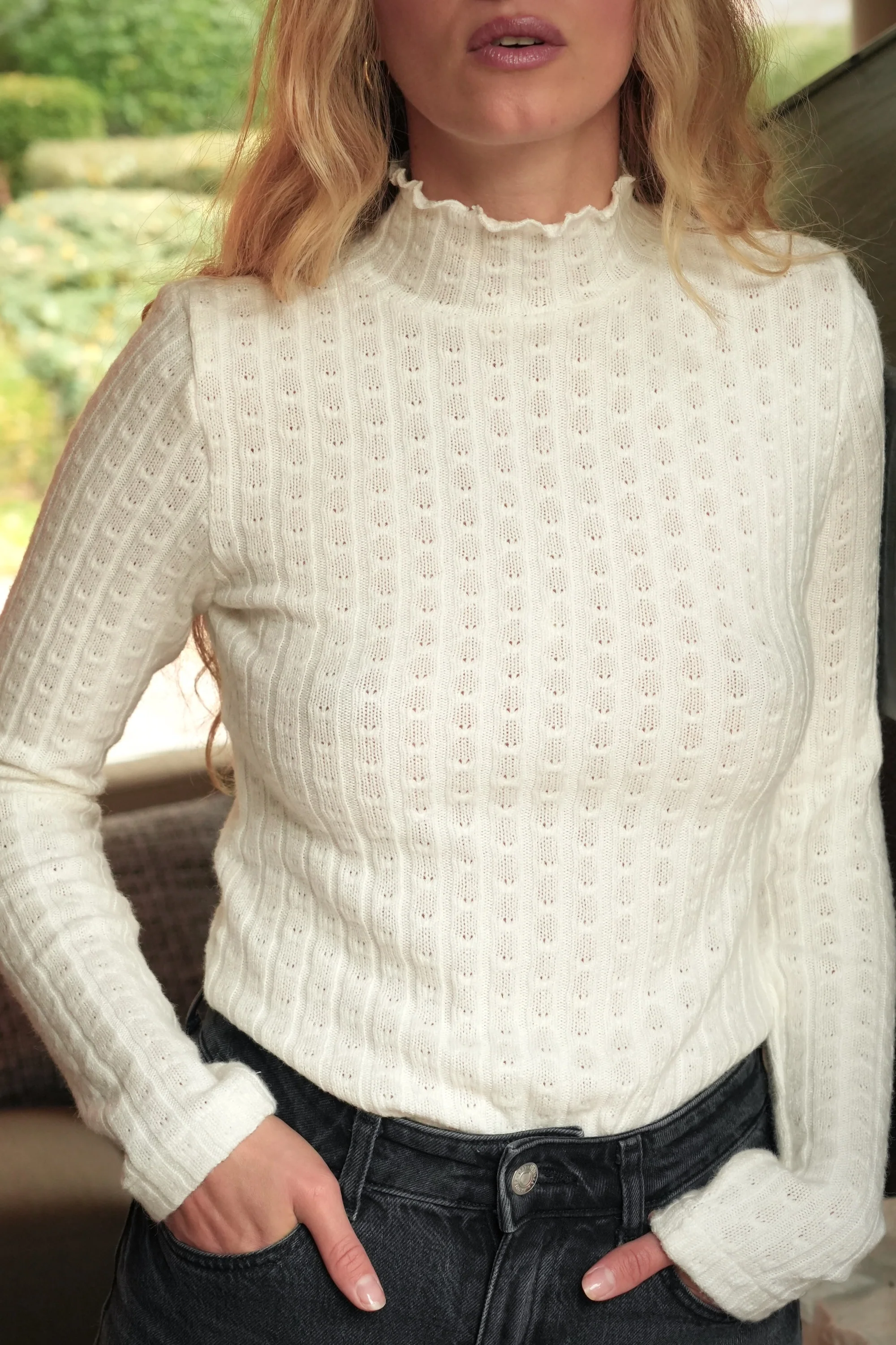 Confectionné dans une maille toute douce et subtilement ajourée, le pull Monica séduit par son col montant et sa coupe ajustée. Très versatile, il se porte aussi bien seul que glissé sous vos pièces préférées cet hiver.