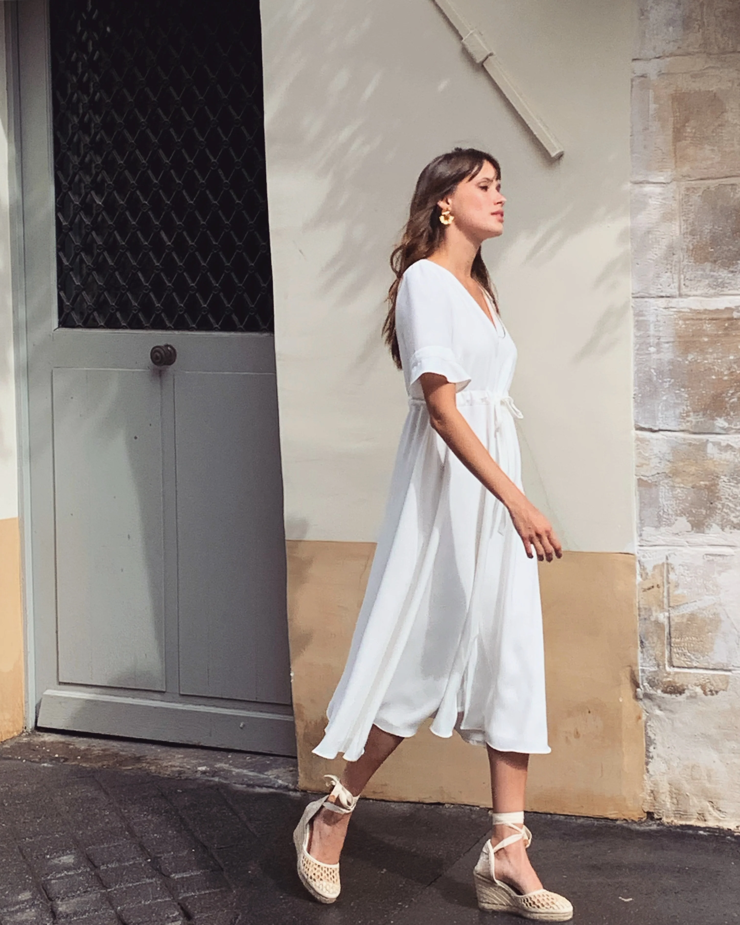 Notre robe Ashley vous suivra tout l'été : tombé ultra fluide, longueur midi, fendue sur le devant, un décolleté en V très féminin et des manches courtes légèrement volantées. On ajuste le ruban pour marquer notre taille. Une silhouette féminine qui nous laisse libre de nos mouvements.