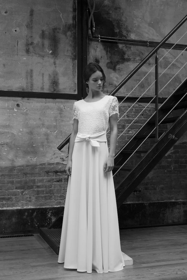 Notre première robe de mariée longue : en crêpe fluide et dentelle de Calais, avec le savoir-faire haute couture de nos couturières. Une robe de créateur sans dépenser des milliers d'euros... La robe Joseph est épurée, aérienne, romantique. La taille se resserre devant ou dans le dos, selon l'envie. Proposée en 3 tailles, elle se retouchera facilement chez votre couturière, aussi bien en largeur qu'en longueur si cela est nécessaire.