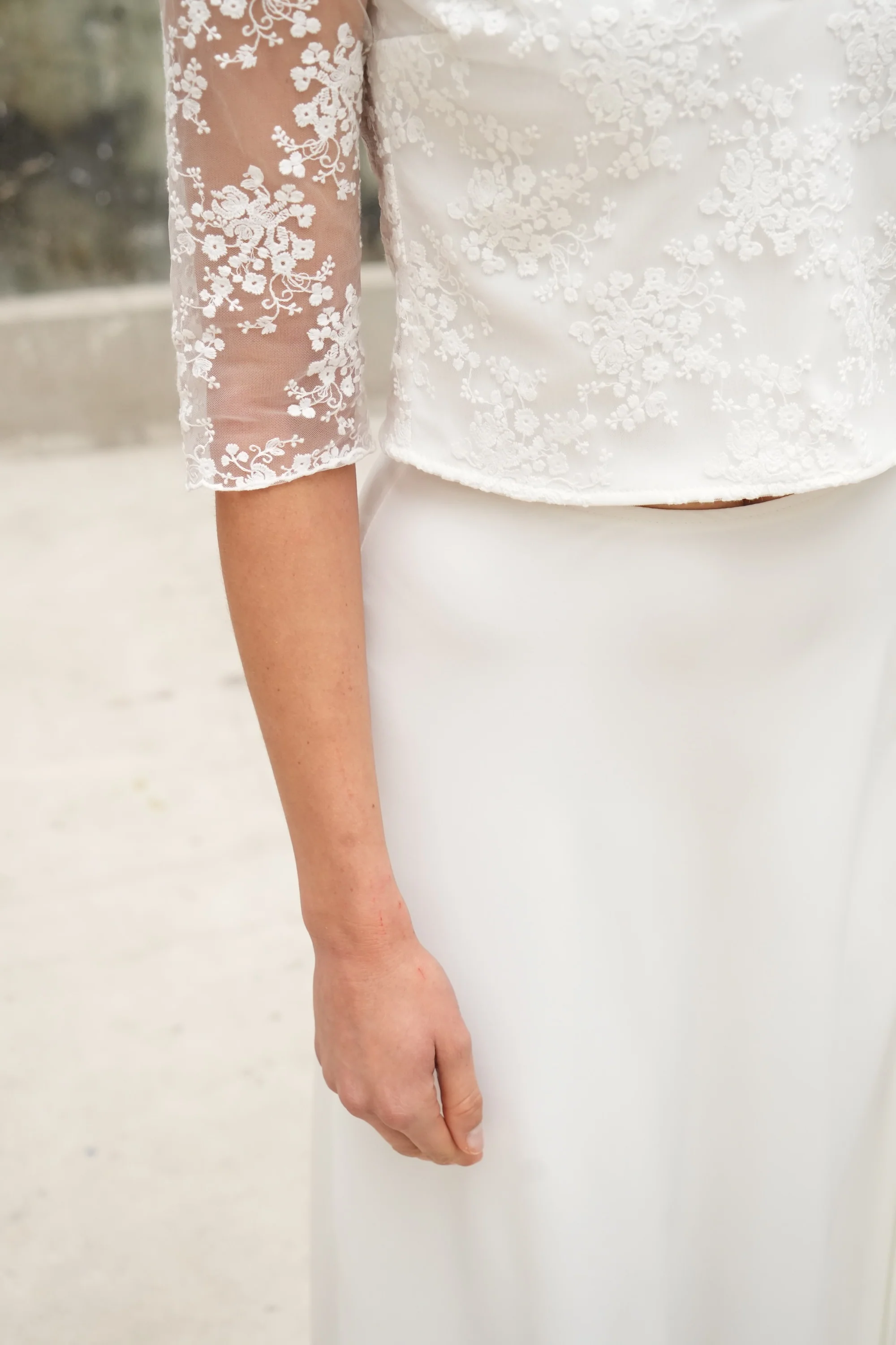 ConfectionnĂ© dans un exceptionnel tulle brodĂ©, le top Florent sĂ©duit par la transparence de son dos boutonnĂ© et son joli dĂ©colletĂ©. Une pièce prĂ©cieuse qui se marie aussi bien avec notre jupe Emmanuel qu'avec un pantalon pour un mariage civil.Â